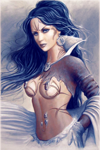 Морриган гордо восседала на вороном коне. Весьма эффектно было лицезреть столь гордый стан на чистокровном скакуне. Но в тоже время весьма странно. Одинокая лошадь, посреди песчаной пустыни. Копыта увязали в сыпучем песке, от чего передвижение животного было весьма затруднительным. Но девушка, казалась, не замечала этих трудностей. Ее самообладание было непоколебимым, ни палящим солнцем, ни периодическими ветрами, ни отсутствием воды. Хотя в дорожных сумках, что были приклеплены к седлу, таилось несколько полных фляг с кристальной водой. А если бы этого запаса и не хватило бы, в запасе чародейки есть пару трюков, которые без труда вызвали бы подземные запасы жизненно необходимого вещества, для любого живого существа. Так что, девушка попросту продолжала свой путь. Она была закутана в черный дорожный плащ, что казался весьма неуместным в данной ситуации. На ногах были черные сапоги, на руки облеченны в черные перчатки под тон. Лицо же было скрыто тканью, которая полностью охватывало лицо девушки. Лишь маленький прорез для глаз и не более того. Именно это дополняло общую картину кочевницы, ибо они как раз и придумали обматывать лицо тканью, дабы предотвратить попадание песка во время песчаных бурь.